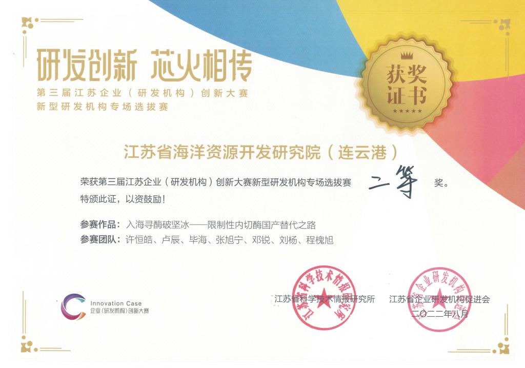 8月25日,第三届江苏企业(研发机构)创新大赛新型研发机构专场选拔赛在常熟市举行。我院选送的案例“入海寻酶破坚冰—限制性内切酶国产替代之路”案例通过预赛,在决赛中经路演、专业评审和大众评审评分,在来自全省的18家参赛的优秀新型研发机构中脱颖而出,荣获二等奖。比赛期间,我院还与省内其他高水平新型研发机构进行了充分交流,为今后加强自身建设,推动产学研合作,促进成果转化积累了宝贵经验。